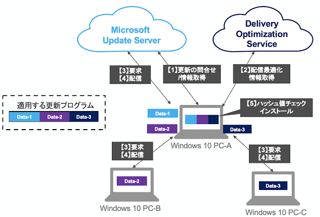 【2】次にPC-Aは 配信最適化(Delivery Optimization)のクラウド サービスに問い合わせを行い、更新プログラムのデータの取得先情報を取得します。